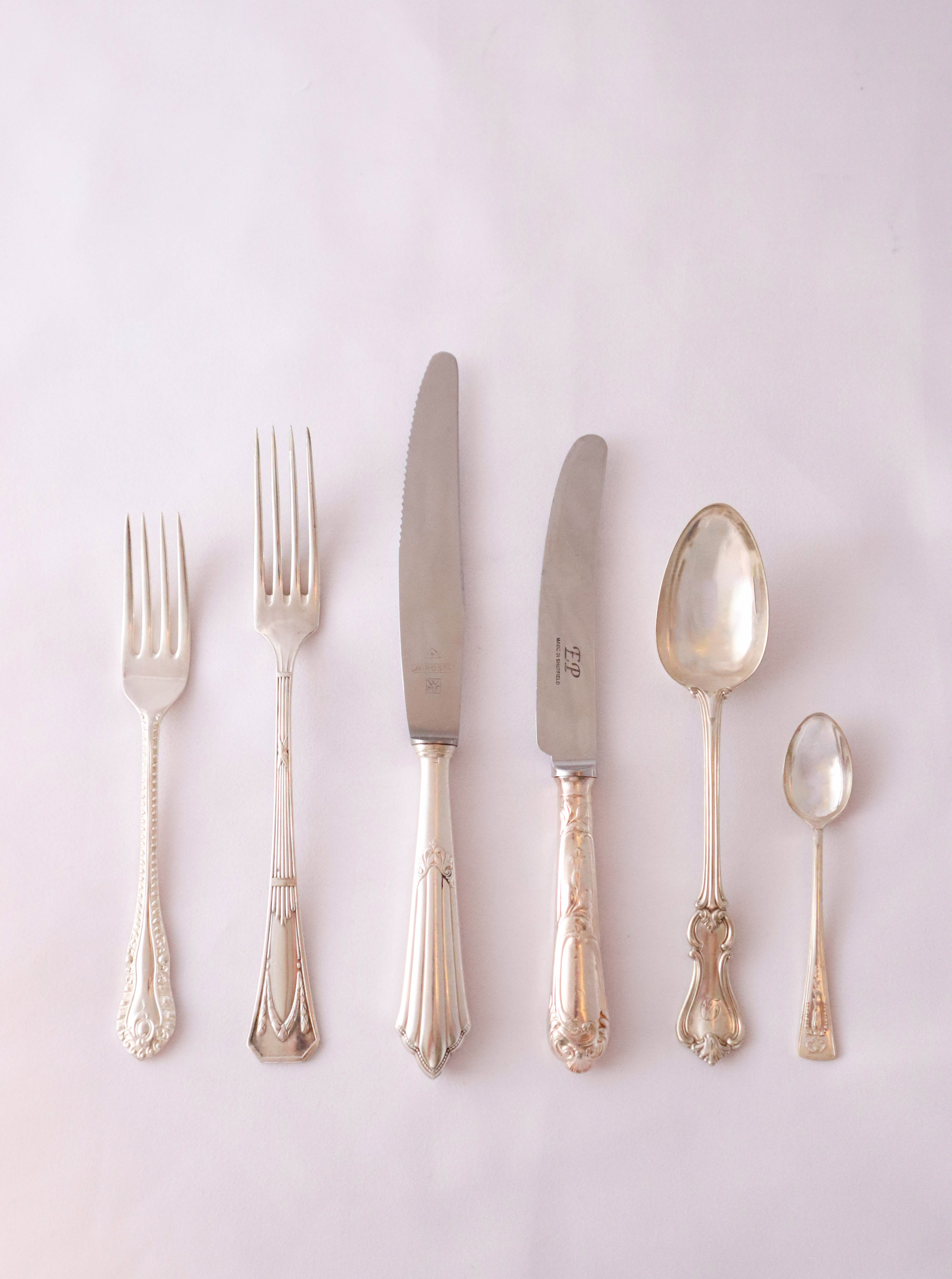 A curated assortment of antique and vintage dessert spoons in silver and silver plate, carefully sourced from France and the UK. Each piece carries the timeless elegance of European craftsmanship, adding refinement and character to the table.