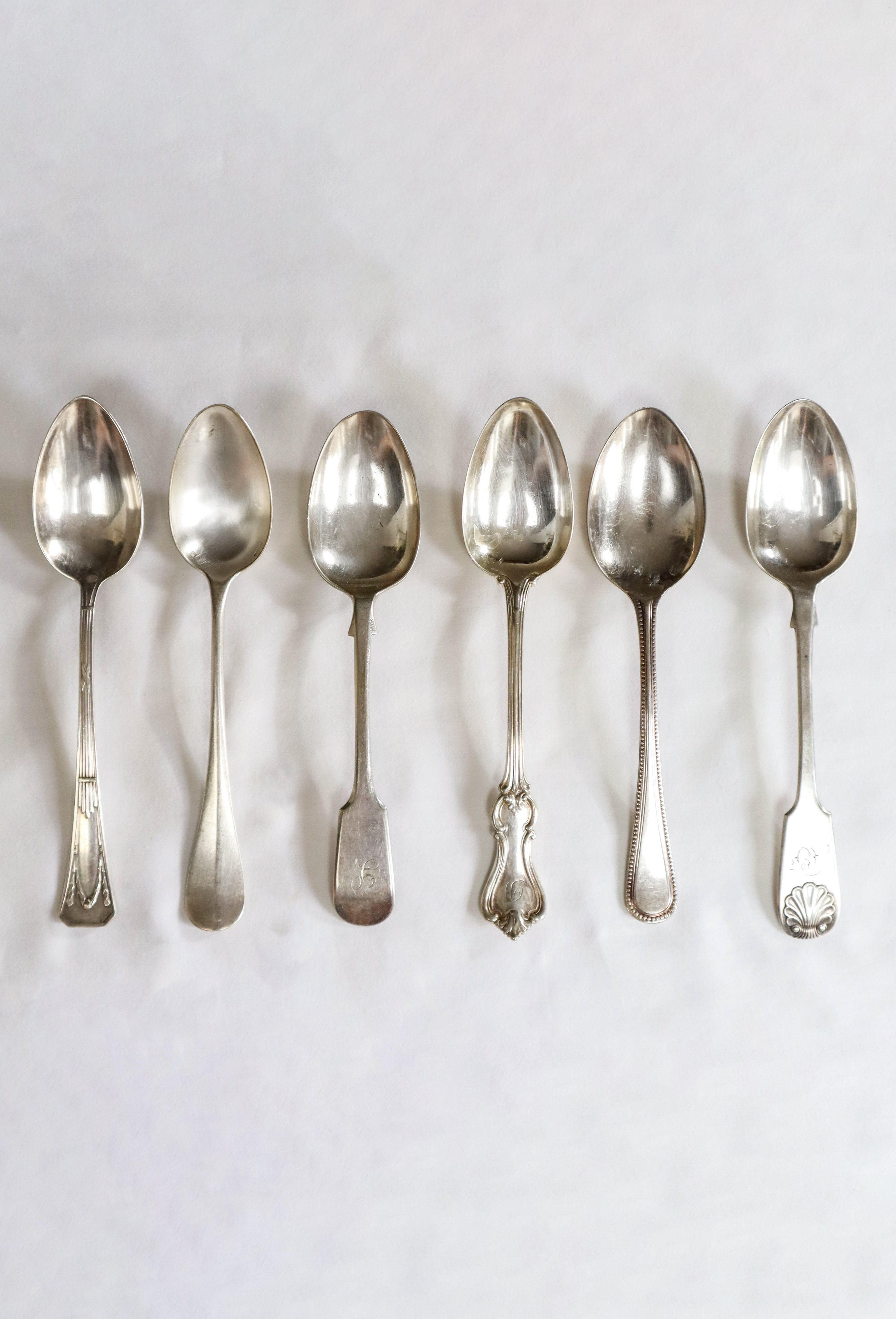 A curated assortment of antique and vintage dessert spoons in silver and silver plate, carefully sourced from France and the UK. Each piece carries the timeless elegance of European craftsmanship, adding refinement and character to the table.